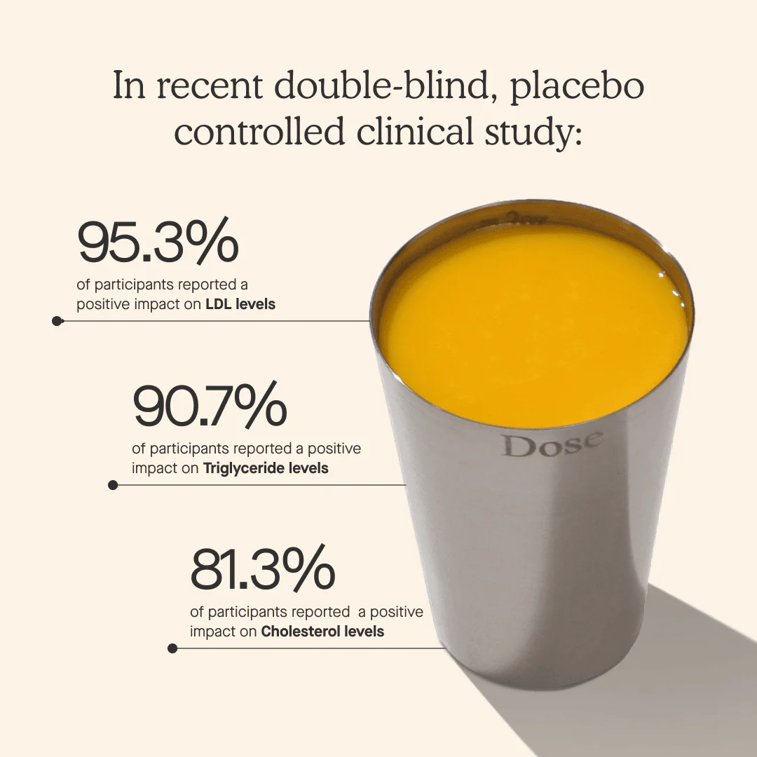 According to the manufacturer’s product page, Dose for Cholesterol is designed to “support and maintain healthy cholesterol and triglyceride levels, aid cardiovascular health”. Amazon+2Dose+2