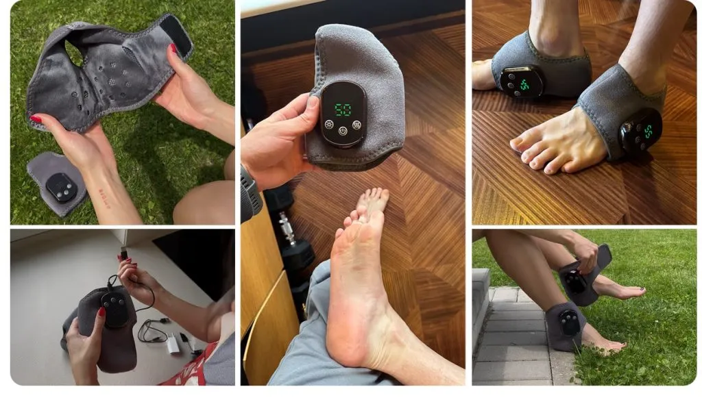 EMSense looks like a fancy foot wrap. You slide your foot in, turn it on, and it does three things at once.